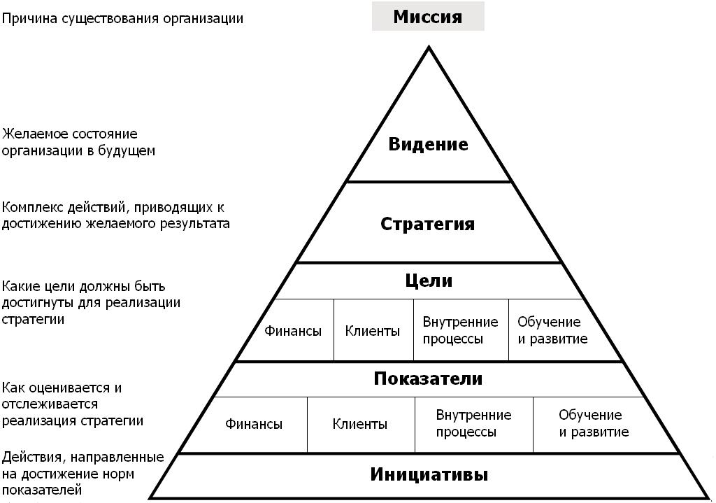 Каплан и Нортон предложили оценивать деятельность компаний с точки зрения четырех перспектив: финансовой, клиентской, внутренних процессов, обучения и развития персонала. Финансовая перспектива - традиционная для оценки результативности организации. Три других перспективы ориентируются на управление нематериальными активами, поскольку, в конечном счете, именно они определяют успех компании. Другими словами сбалансированная система показателей переводит миссию, ценности, видение и стратегию организации, в стратегические цели и показатели деятельности по каждой из четырех составляющих.