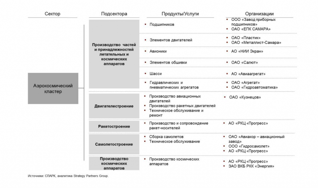 Основу аэрокосмического кластера Самарской области составляют такие предприятия, как АО «Ракетно-космический центр «Прогресс», ПАО «Кузнецов», ОАО «Авиакор – авиационный завод», ОАО «Авиаагрегат», ОАО «Агрегат», ОАО «Металлист-Самара», государственное   предприятие «Научно-исследовательский институт «Экран», ОАО «Салют».